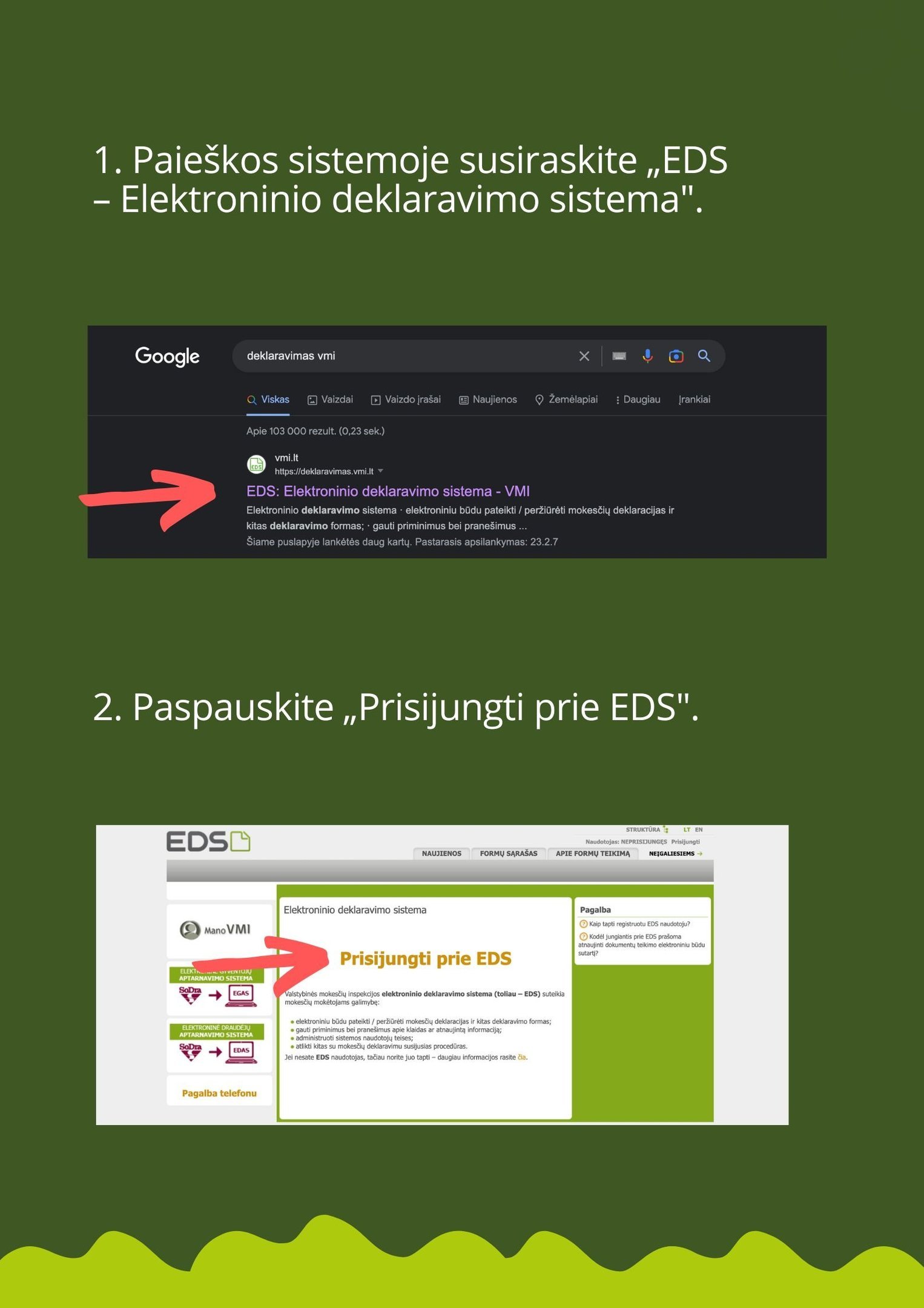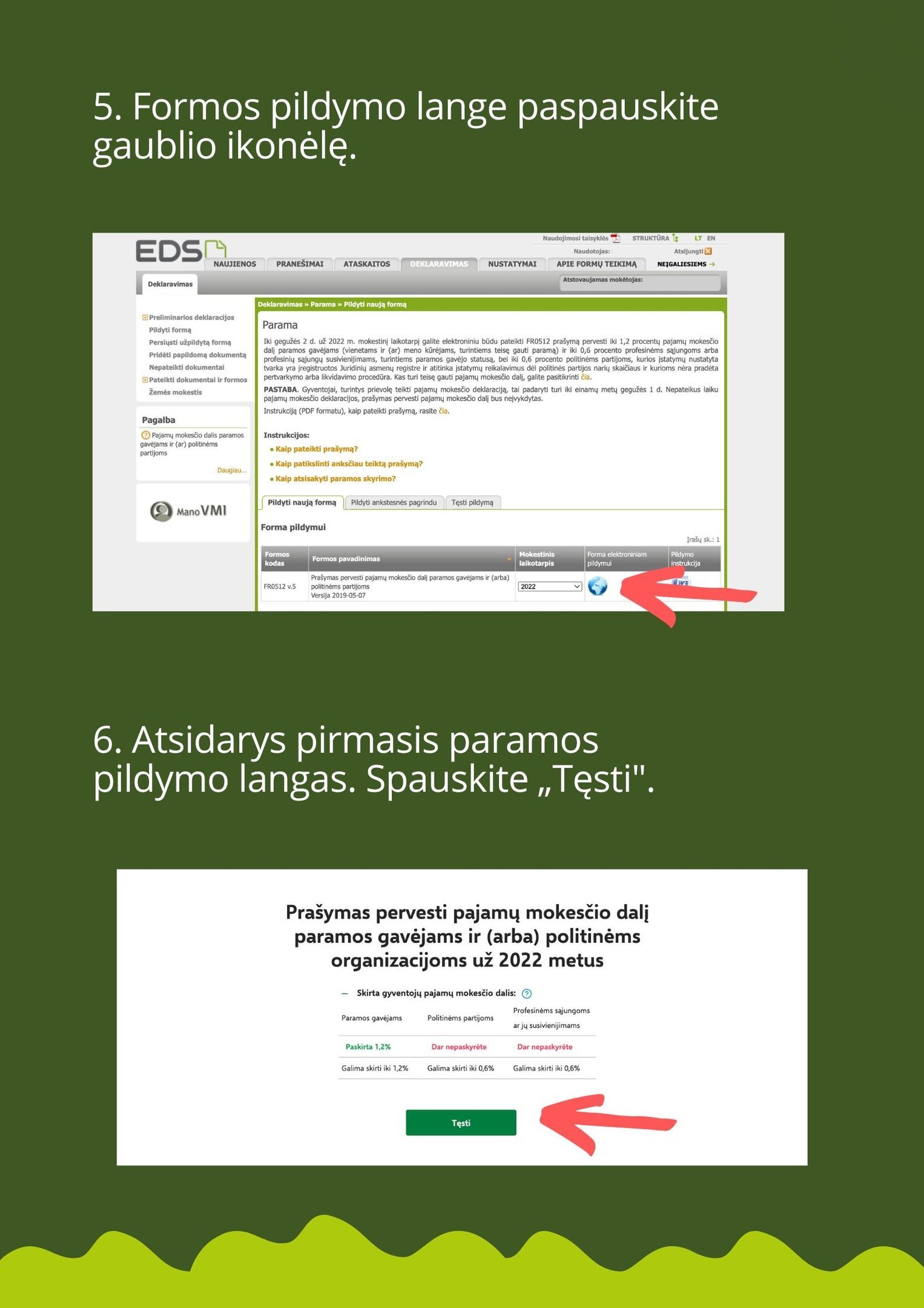 1,2% GPM paramą galite skirti nuo 2025 m. sausio 1 d. iki 2025 m. gegužės 1 d. užpildant prašymą elektroniniu būdu per VMI elektroninio deklaravimo sistemą (EDS). Instrukciją rasite žemiau.